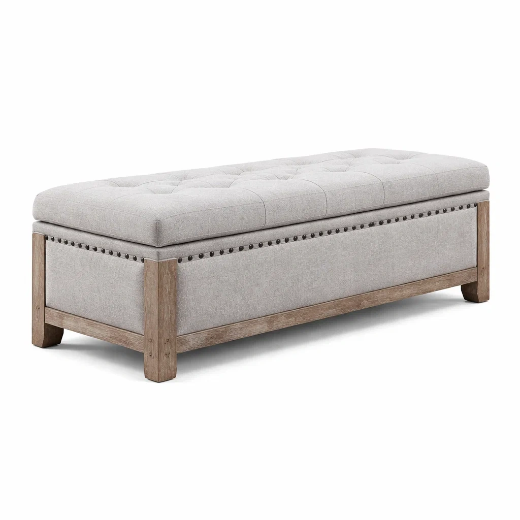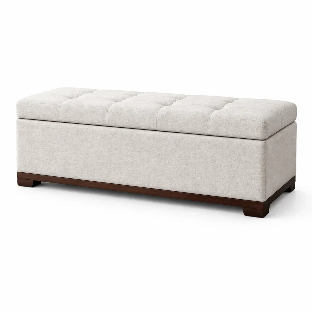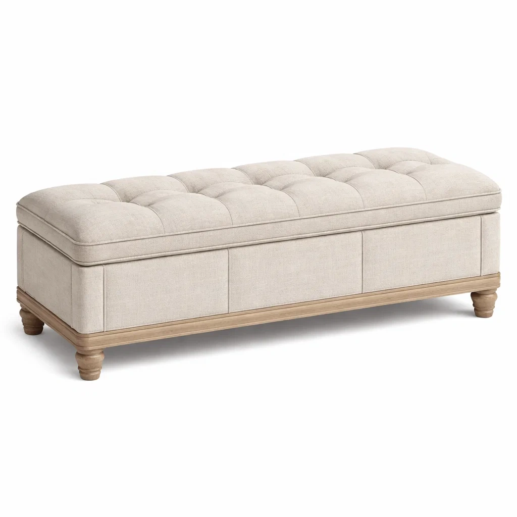 Banc de rangement en bois et tissu en lin beige