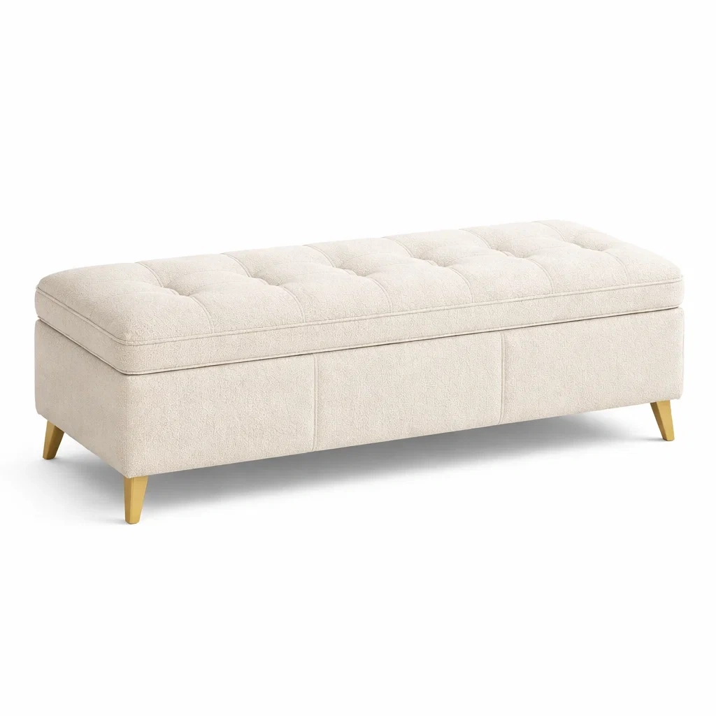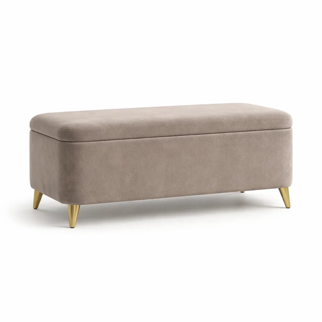 Banc de rangement en velours beige avec pieds en métal doré