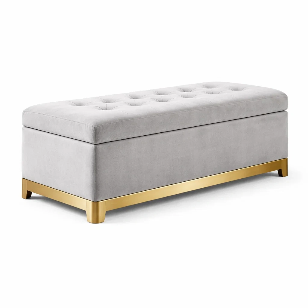Banc de rangement en velours avec pieds en métal doré