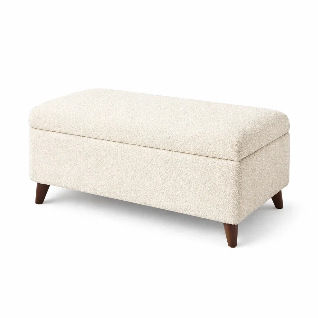Banc de rangement en tissu beige avec pieds en bois