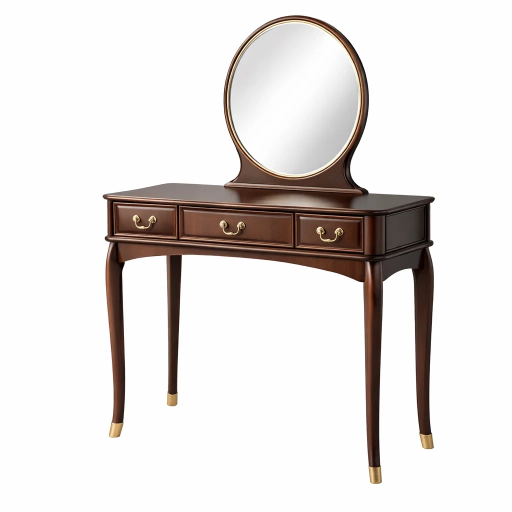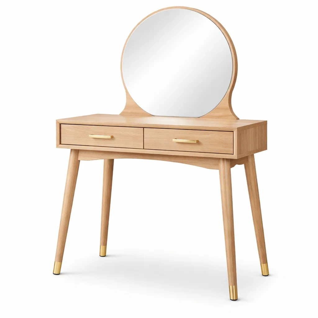 Coiffeuse en bois avec miroir rond et tiroirs