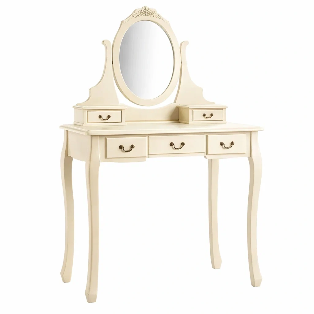 Coiffeuse en bois MDF ivoire avec miroir ovale et tiroirs