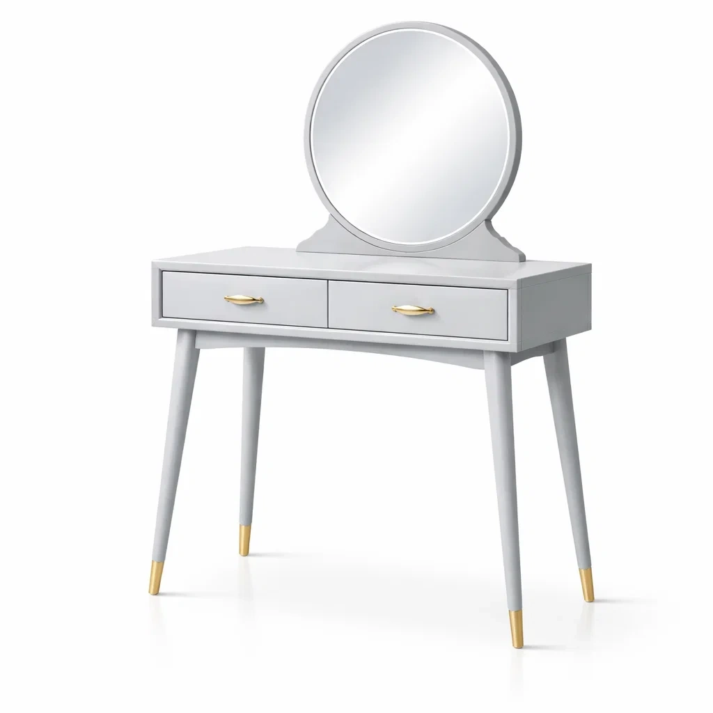 Coiffeuse en bois avec miroir rond et tiroirs gris