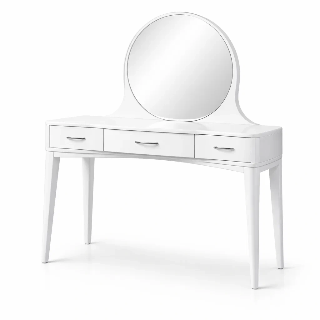 Coiffeuse en bois avec miroir rond et trois tiroirs