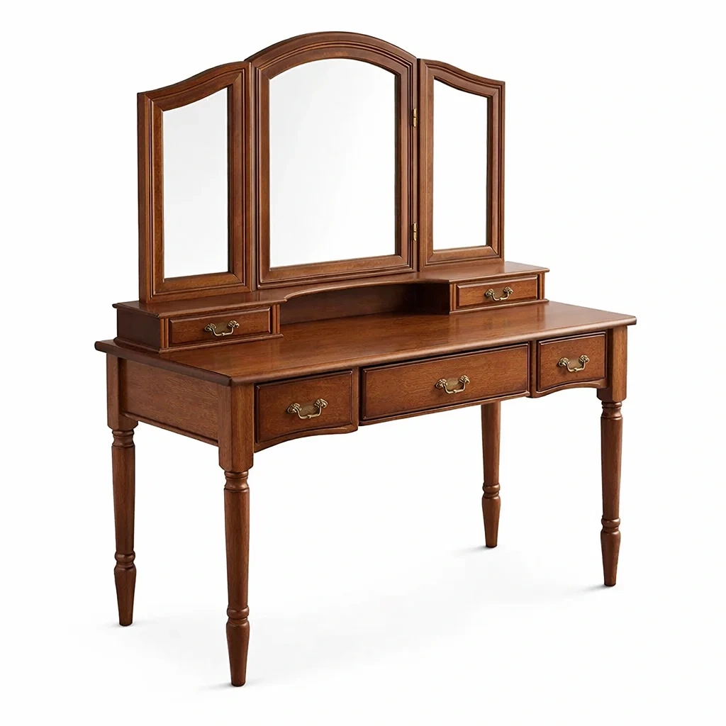 Coiffeuse en bois avec miroir triptyque et tiroirs marron