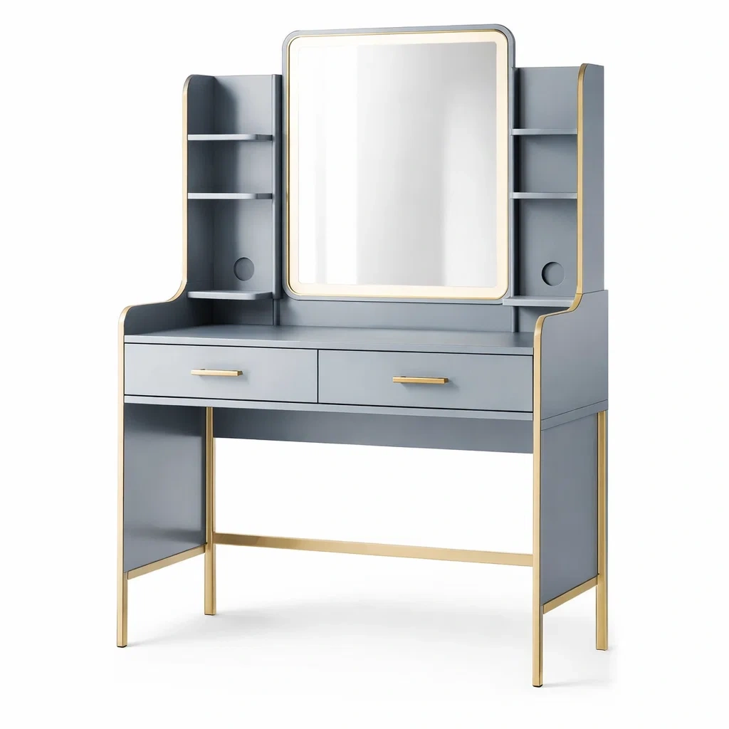 Coiffeuse en MDF avec miroir et étagères dorées 100 x 50 x 140 cm