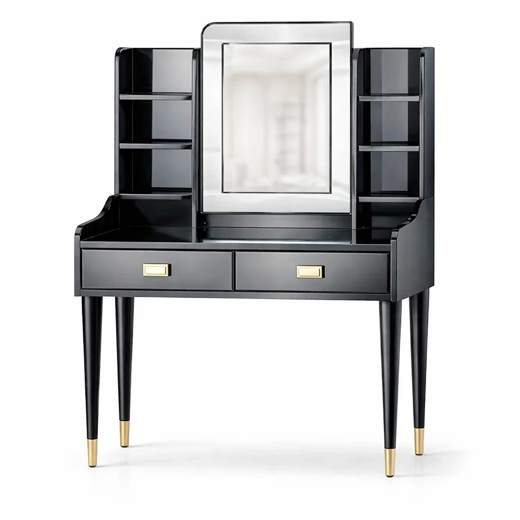 Coiffeuse en bois MDF noir avec miroir et étagères