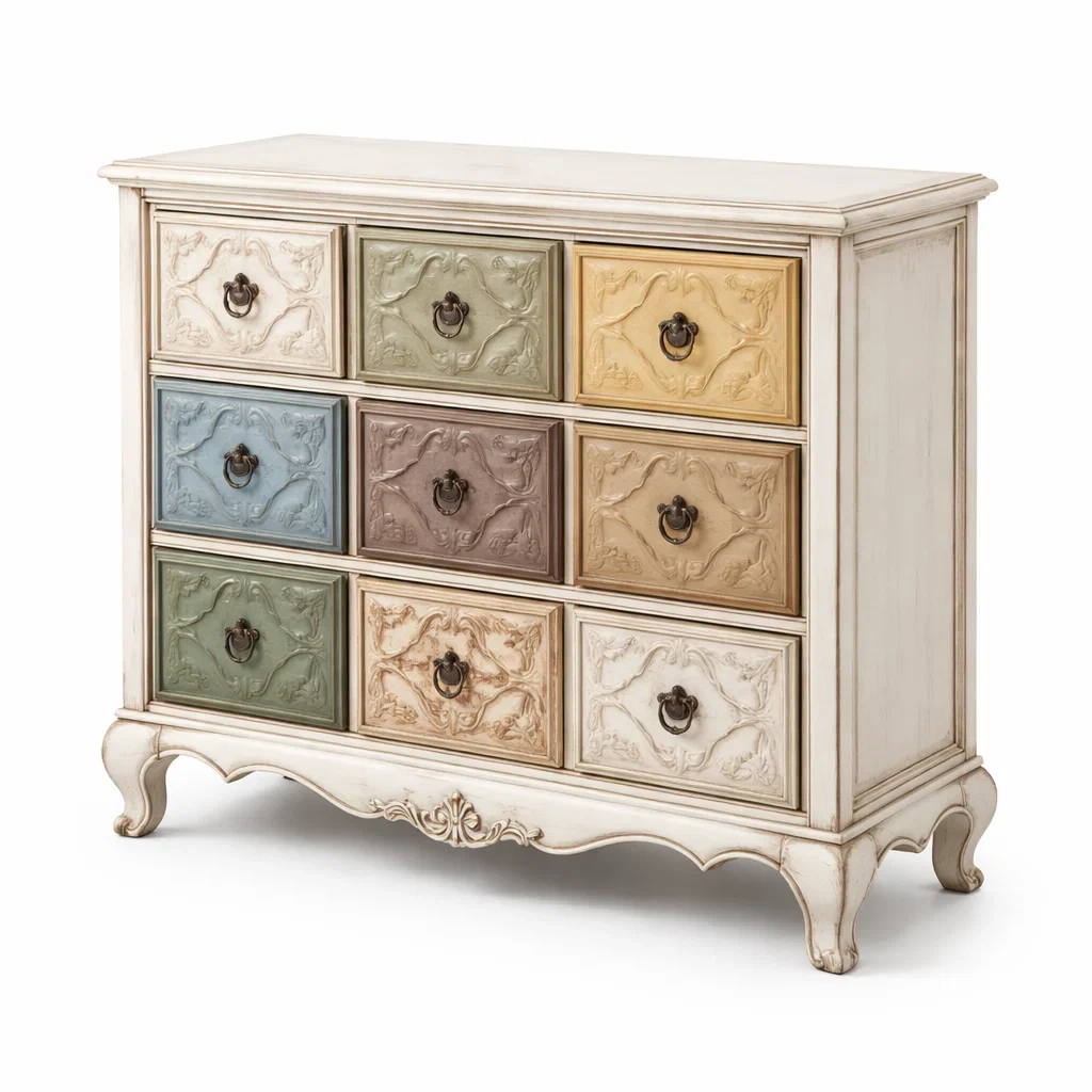 Commode en bois massif 9 tiroirs multicolores