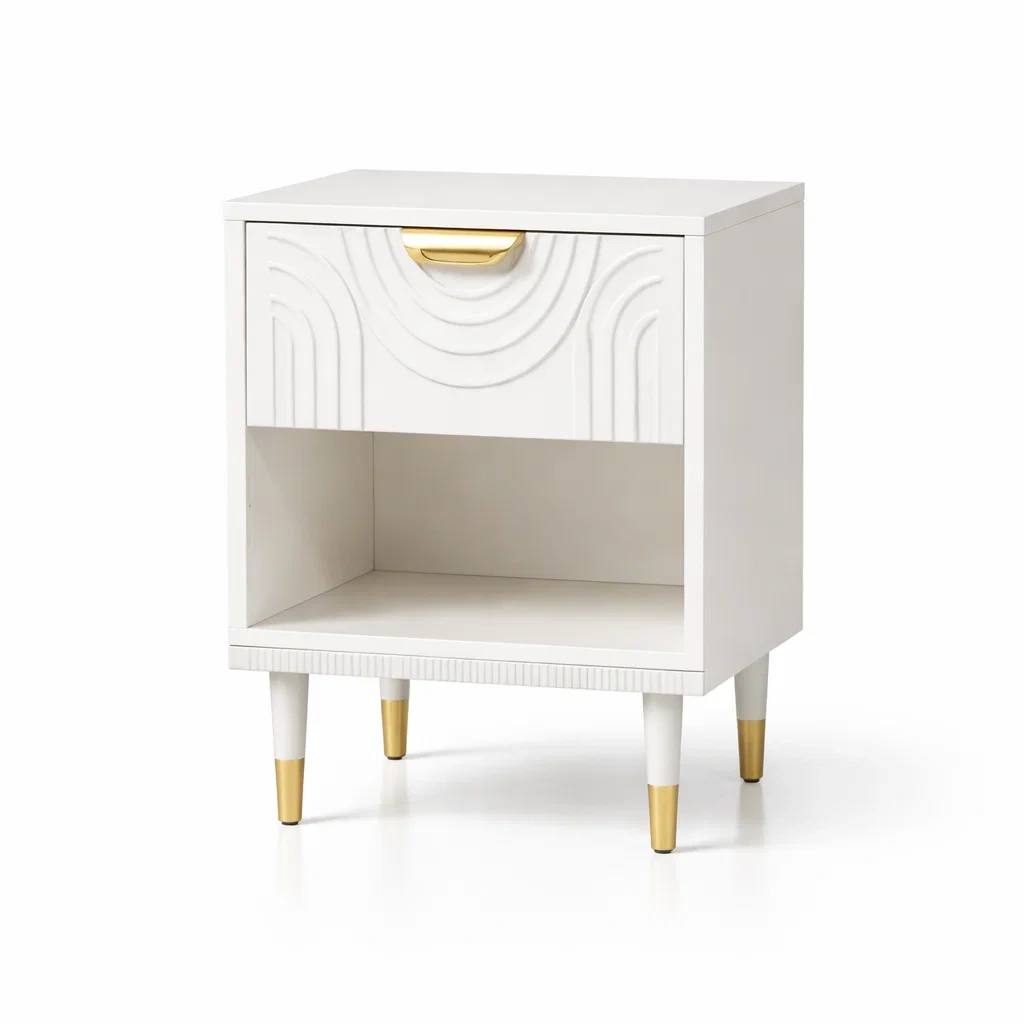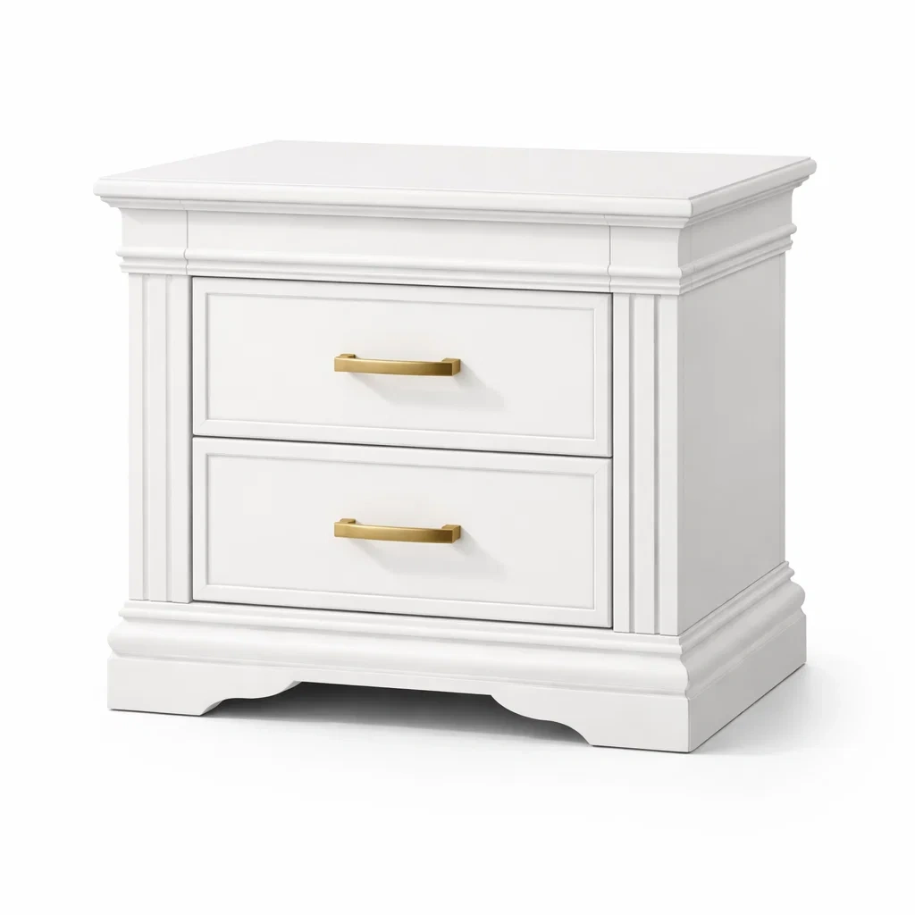Table de chevet en bois blanc avec poignées dorées