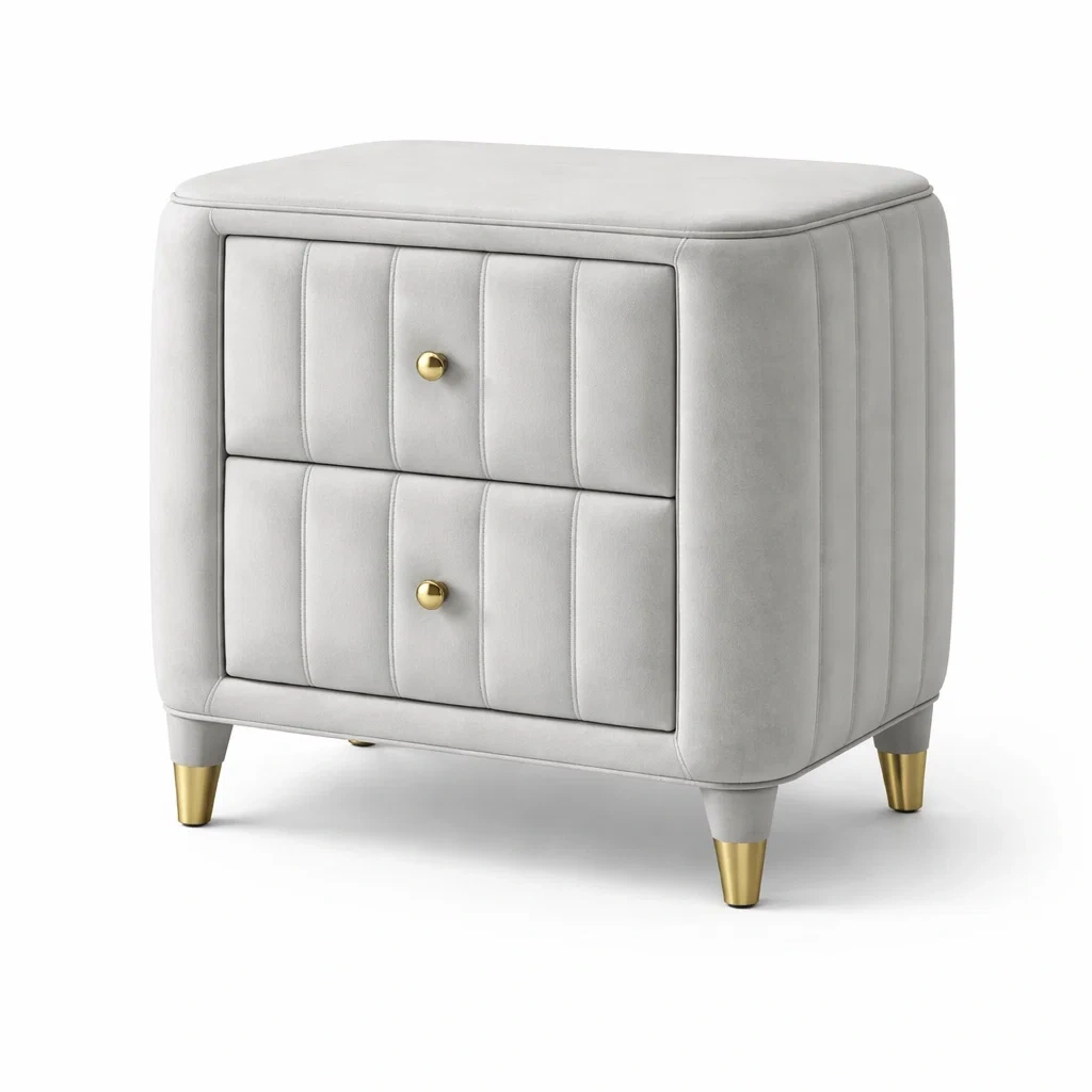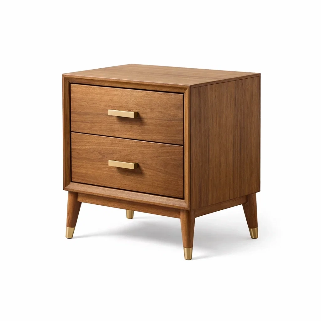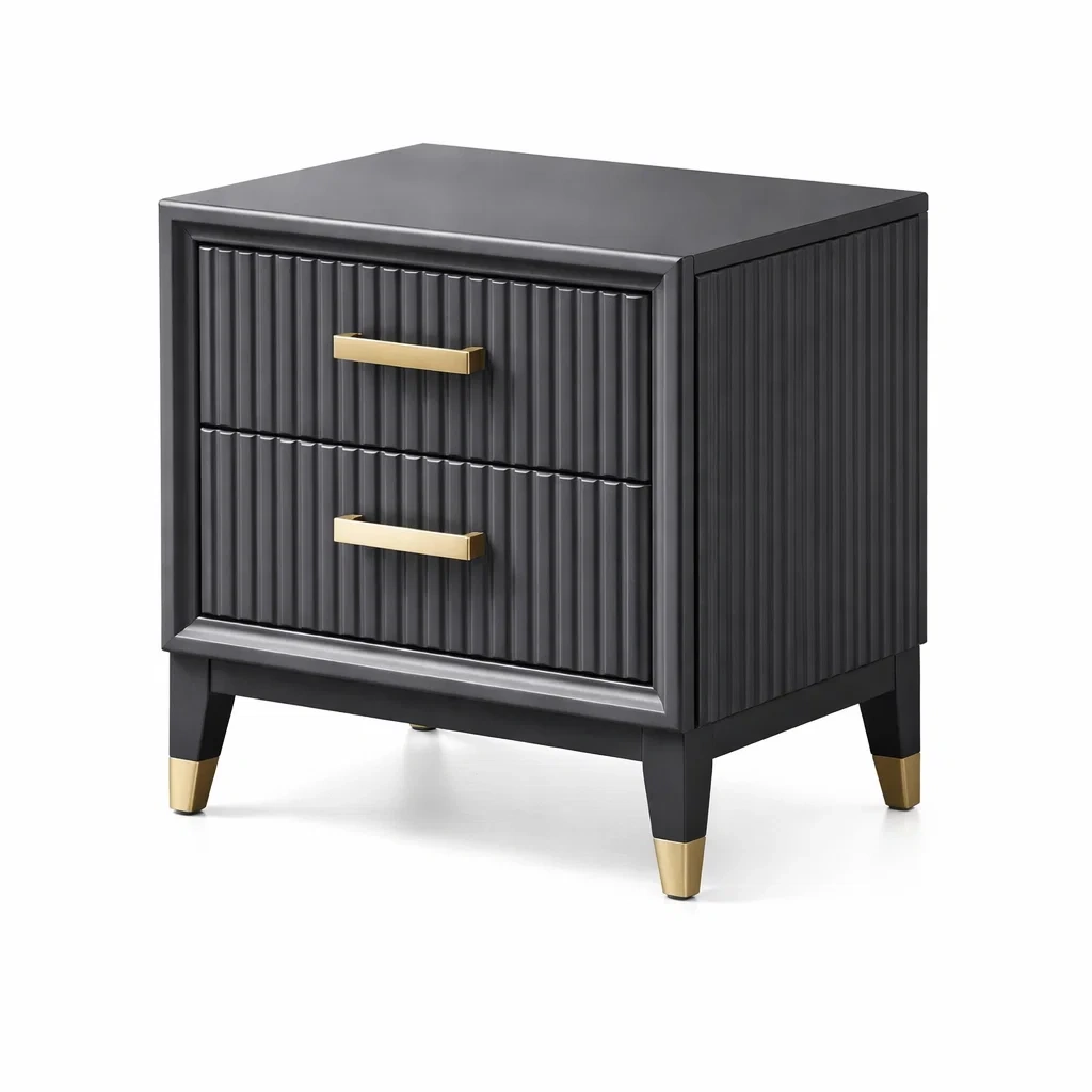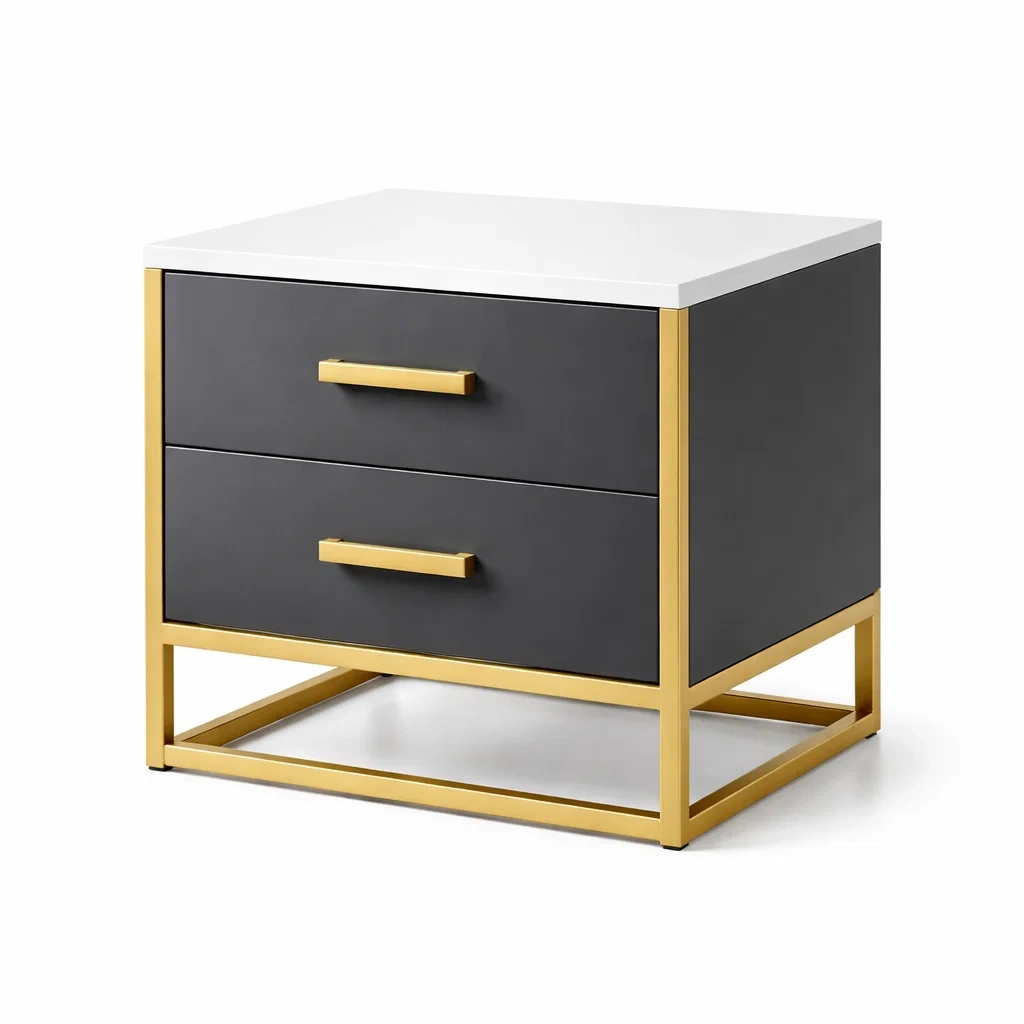 Table de chevet en bois avec 2 tiroirs et poignées dorées