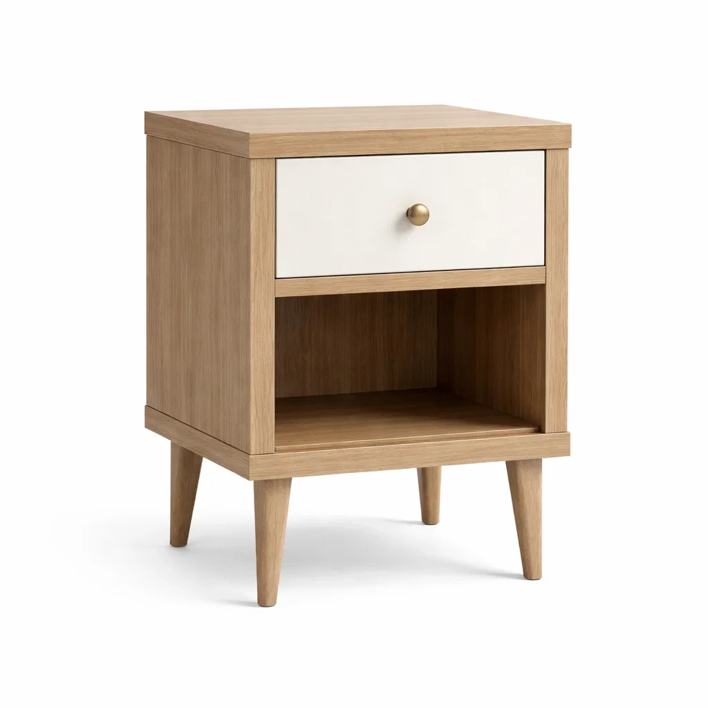 Table de chevet en bois MDF et chêne naturel avec tiroir blanc
