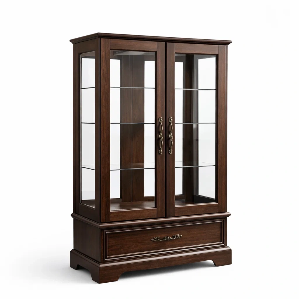 Vitrine en bois avec portes en verre et tiroir marron
