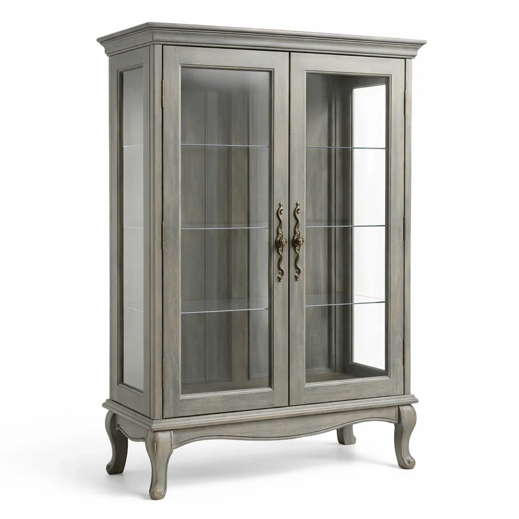 Vitrine en bois MDF et verre trempé gris avec pieds métalliques