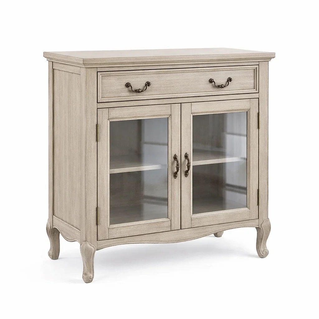 Type de portes et tiroirs : Deux portes en verre avec poignées métalliques, un tiroir