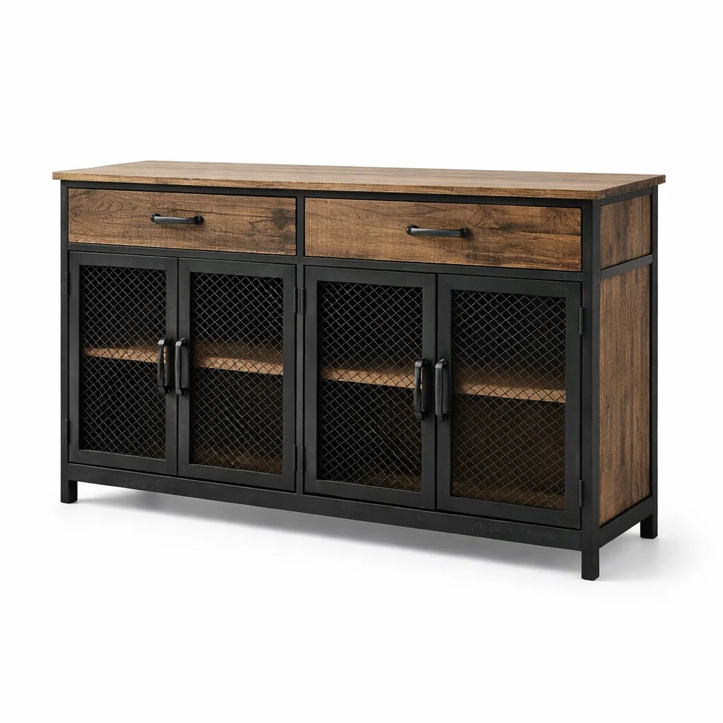 Buffet en bois MDF avec cadre en métal. Deux tiroirs et quatre compartiments avec portes grillagées permettent un rangement pratique. Dimensions : 120x40x80cm.