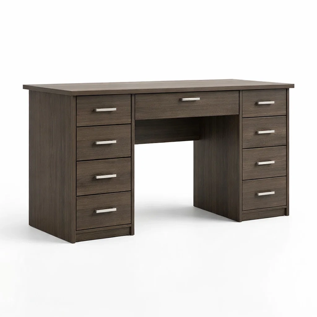 Ce bureau rectangulaire est fabriqué en bois aggloméré avec une finition stratifiée brune. Il dispose de 9 tiroirs pour optimiser le rangement.