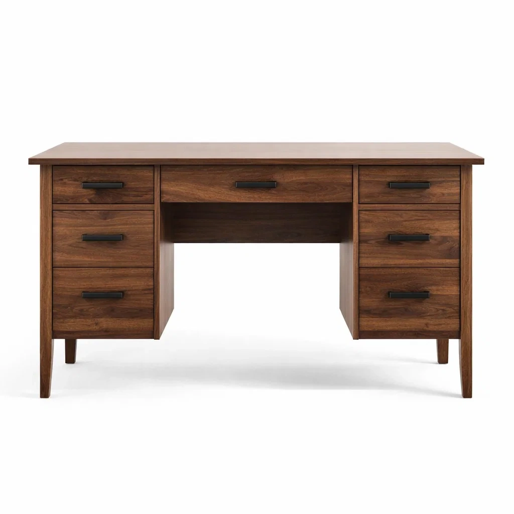 Ce bureau est fabriqué en bois de noyer massif avec des poignées en acier noir. Il dispose de sept tiroirs offrant un espace de rangement pratique. Les dimensions du bureau sont de 150 cm de longueur, 75 cm de largeur et 76 cm de hauteur. Le poids total est de 35 kg. Capacité de charge maximale de 100 kg.
