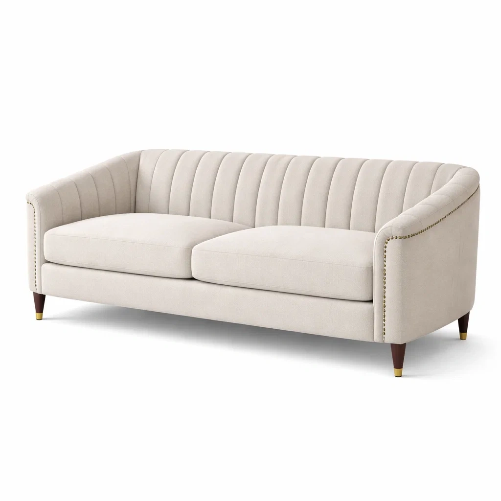 Ce canapé 3 places est fabriqué en tissu polyester, offrant une assise confortable grâce à son rembourrage en mousse haute densité. Sa structure est en bois massif, garantissant solidité et durabilité. Les pieds sont en bois, ajoutant une touche élégante au design général. Les accoudoirs sont rembourrés pour un confort supplémentaire.