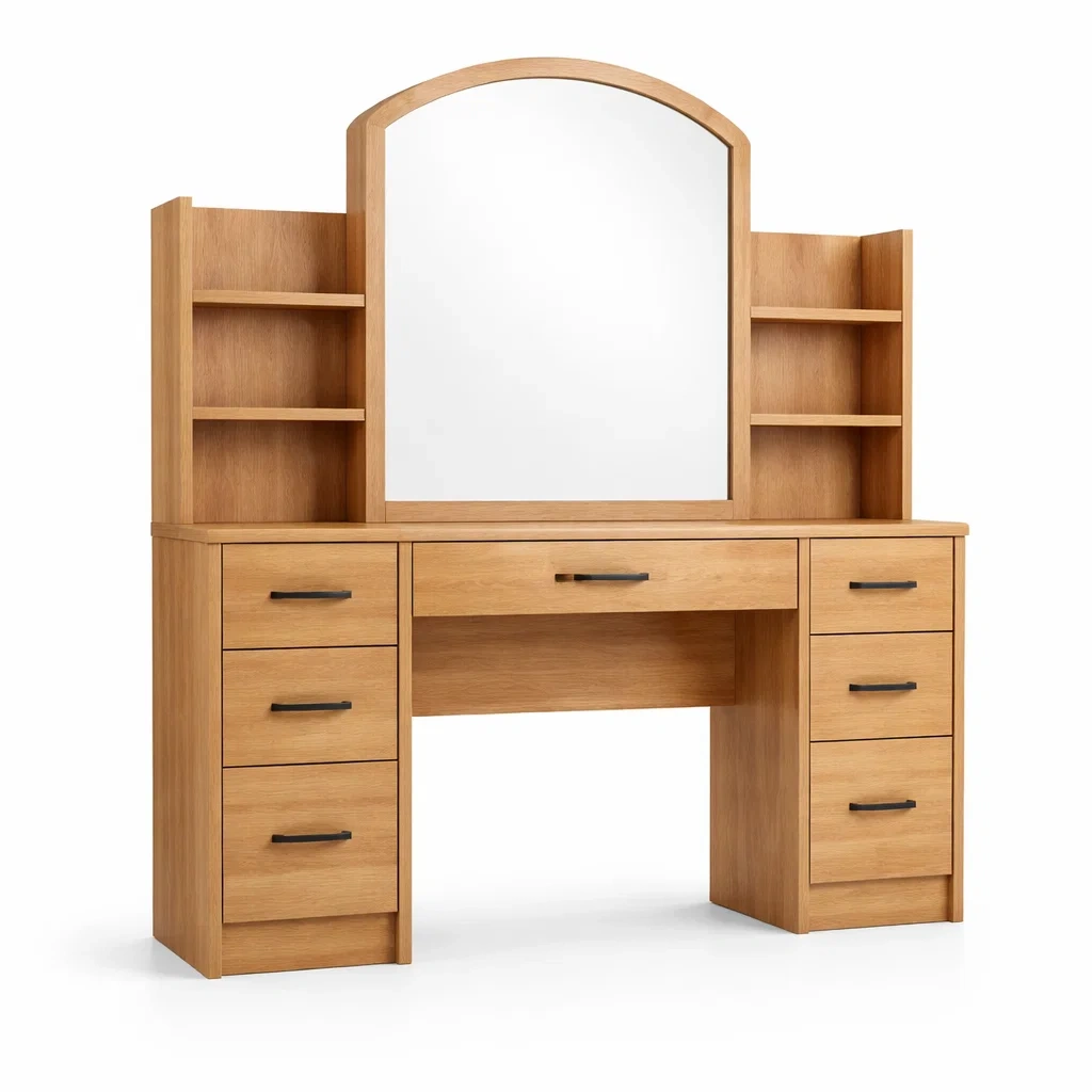 Cette coiffeuse est fabriquée en bois de chêne et comprend un miroir arqué. Elle est équipée de 7 tiroirs et de 4 tablettes pour offrir un espace de rangement pratique.