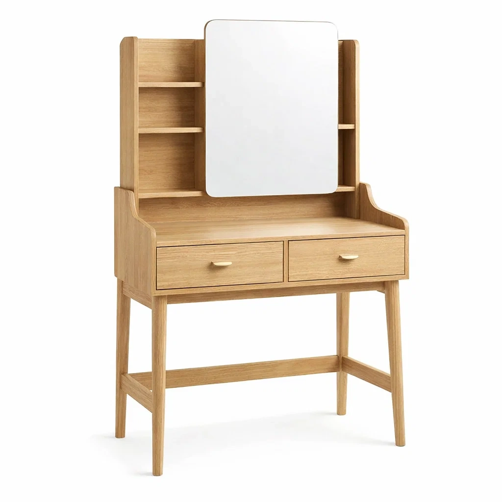Elle dispose d'un miroir intégré, de deux tiroirs de rangement et d'étagères latérales pour ranger vos accessoires et cosmétiques. La surface de travail permet un maquillage pratique.
