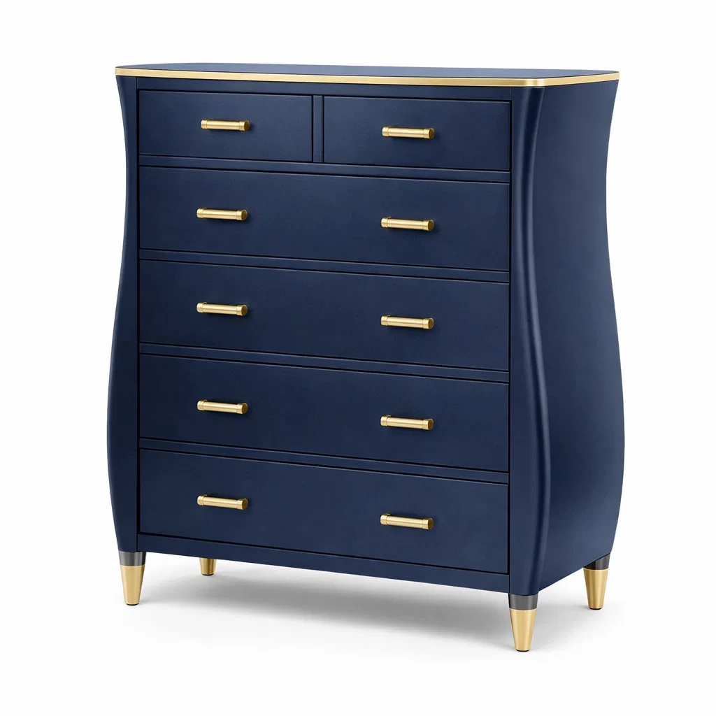 La commode est fabriquée en bois massif avec une finition bleu foncé et des poignées en métal doré. Elle dispose de 6 tiroirs spacieux pour le rangement. Dimensions de la commode : 90 cm de largeur, 120 cm de hauteur, 45 cm de profondeur. Elle pèse environ 45 kg. Un assemblage partiel est requis.