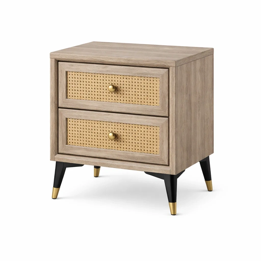 Cette table de chevet se compose d'un corps en MDF plaqué chêne clair et d'une façade en cannage naturel. Les pieds sont en métal avec des embouts dorés. Elle est dotée de deux tiroirs avec poignées métalliques dorées. Dimensions : 60 cm de longueur, 40 cm de largeur, 50 cm de hauteur. Convient pour un usage intérieur.