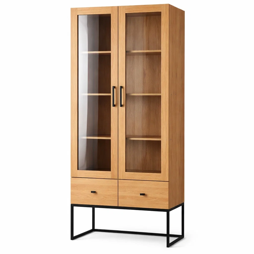 Cette vitrine est fabriquée en bois de chêne avec des portes en verre trempé de 4 mm et une structure en métal. Elle mesure 190 cm de hauteur, 80 cm de largeur et 40 cm de profondeur.